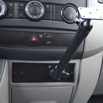 Commercial Mounting Platform with 10 inch Universal Mount. Fits Dodge, Freightliner and Mercedes Sprinter vans and several other vehicles. Designed to attach in a DIN slot in the dash, so an available or open DIN slot is needed. Notice: Includes 10 inch Mount. Separate screws may be needed to mount a device holder. Strong enough to hold a device in the Tough Sleeve. Recommended for devices that are 4 lbs. or less.